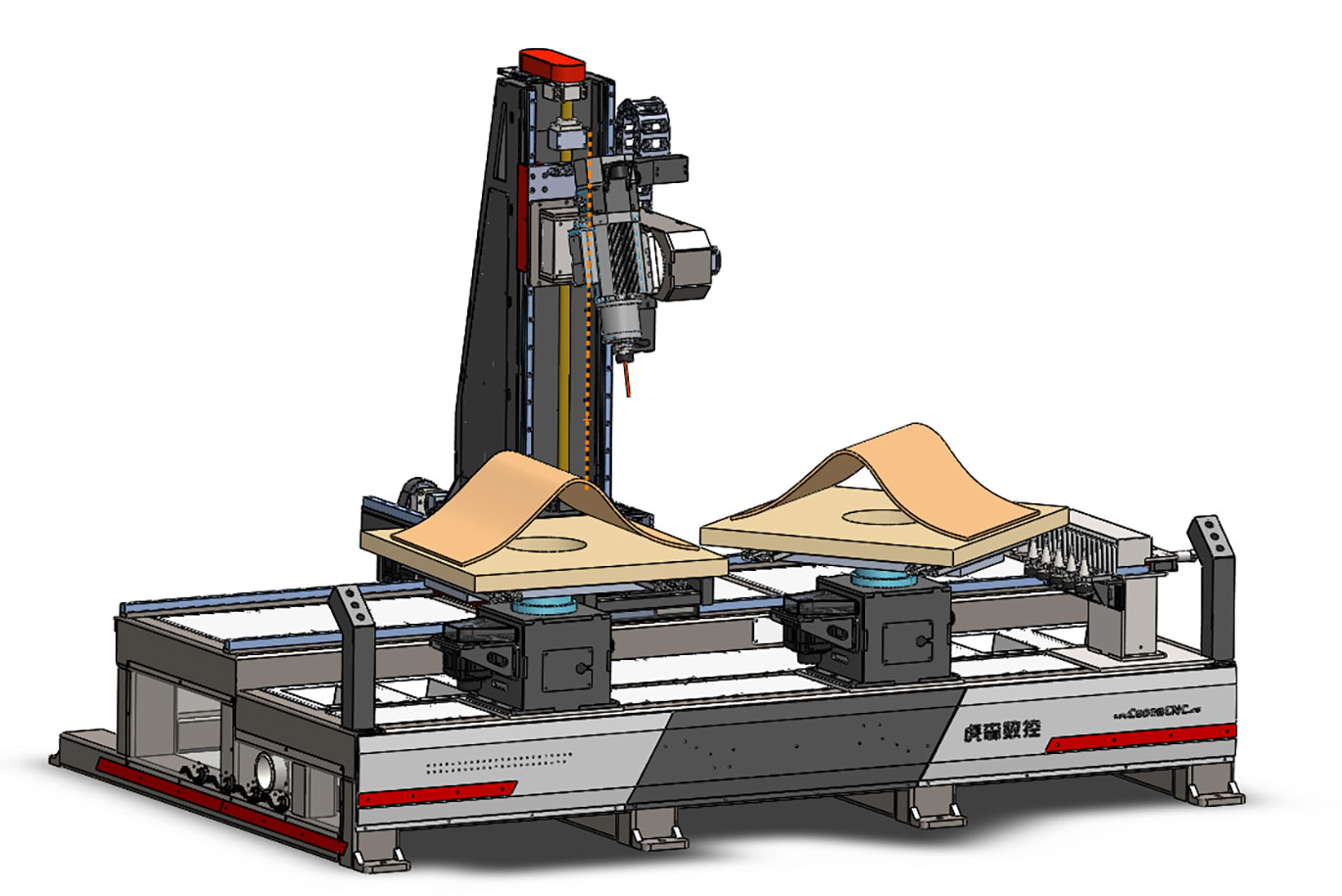 5軸鉆銑加工中心專業(yè)生產(chǎn)餐椅扶手,雙工位交替工作,生產(chǎn)效率高。